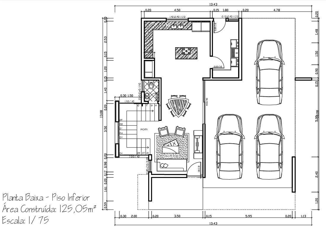 O térreo conta com uma sala ampla, com cozinha americana, que também se comunica com a área de serviço. a ligação com a garagem se dá através de uma grande porta janela oferecendo versatilidade de uso.