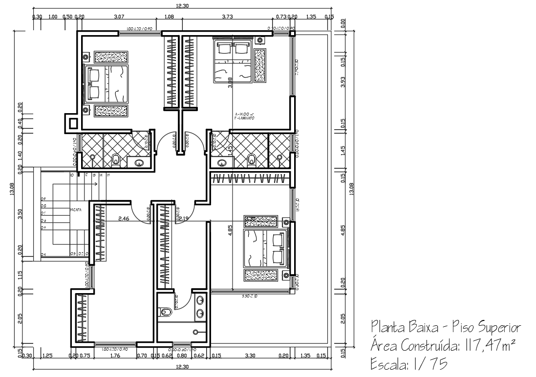 São três suítes dispostas no segundo pavimento, ladeadas com uma grande sacada que contorna a casa.